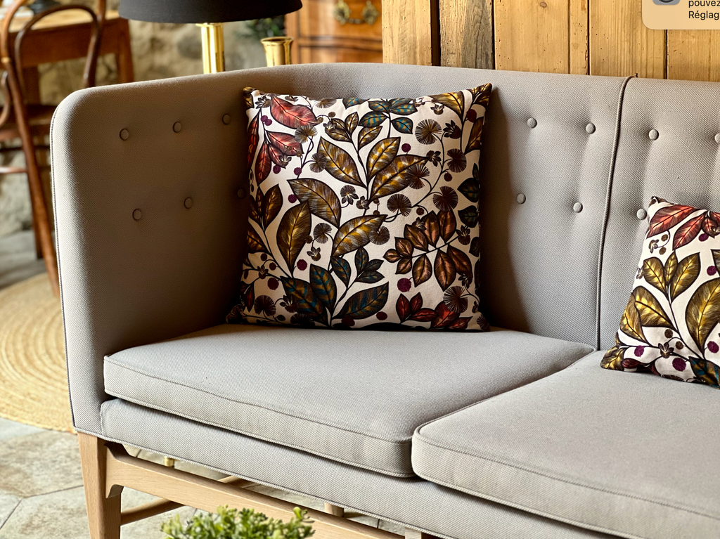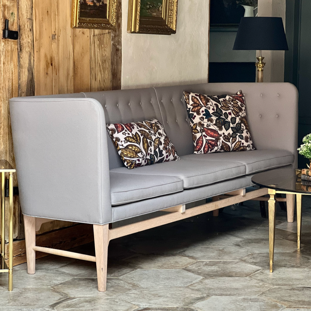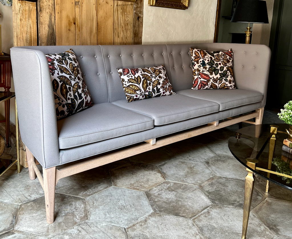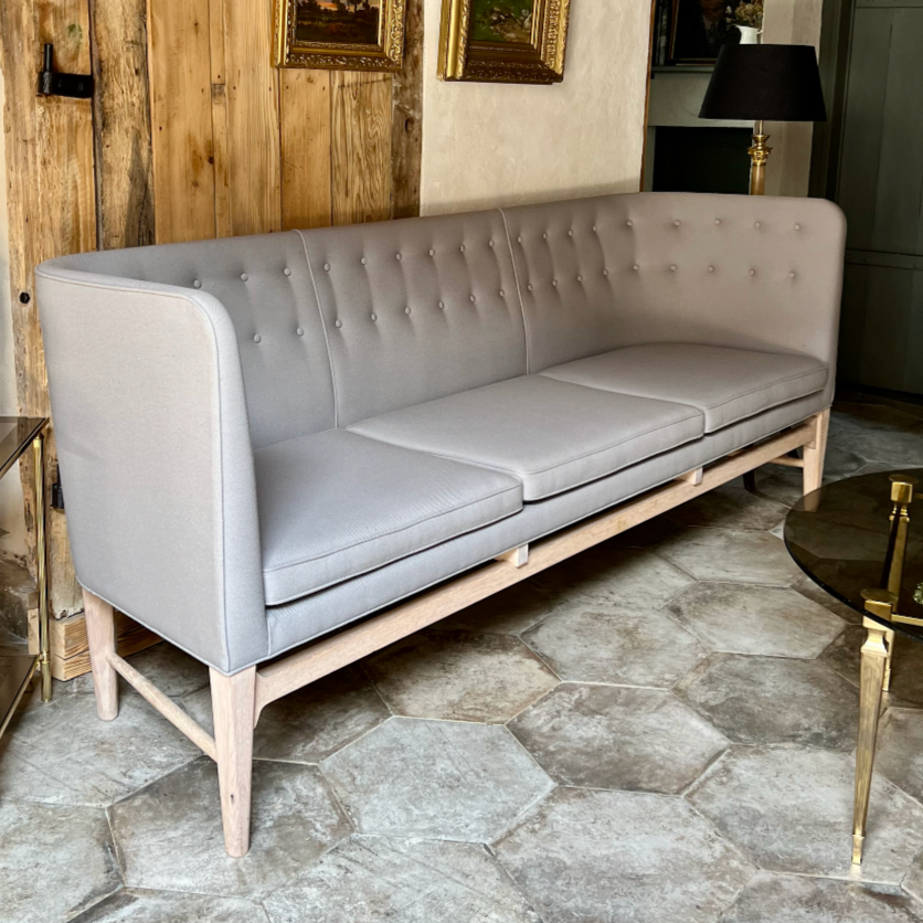 Exemple parfait de la tradition danoise et du travail artisanal du bois. Il se compose d’un piétement en chêne massif et d’une armature en bois formant l’assise et le dossier. L’habillage de la structure et les 3 coussins avec mousse sont recouverts d’un tissu gris en parfait état. La forme et les lignes simples de ce sofa lui confèrent une ergonomie parfaite.