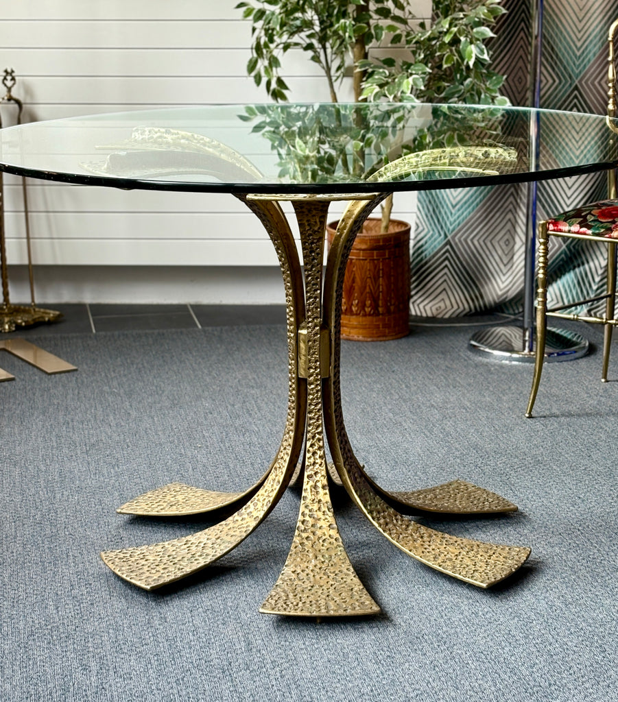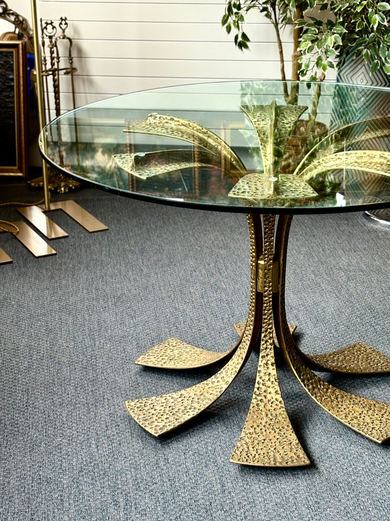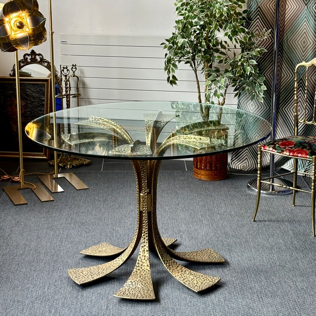 Magnifique table en bronze martelé et verre fumé du designer italien Luciano Frigerio, années 70.