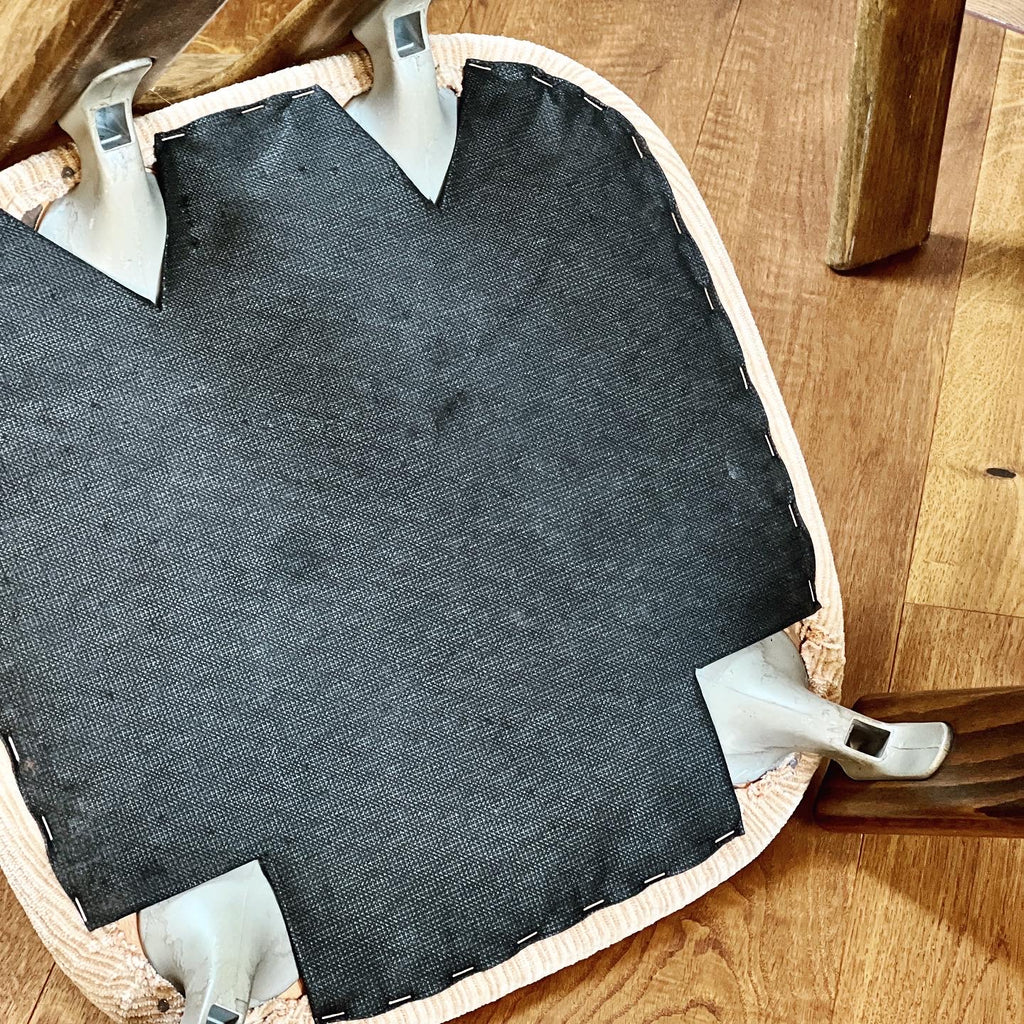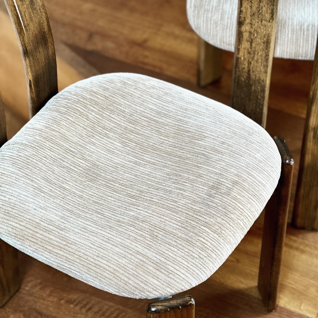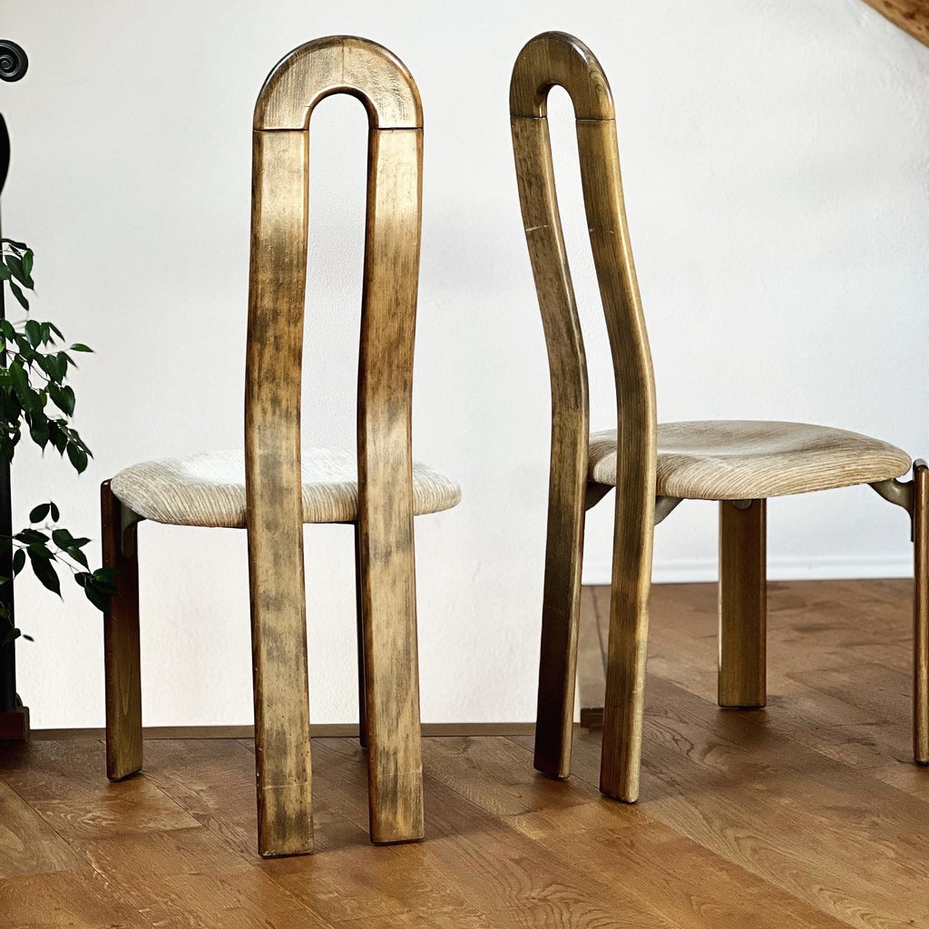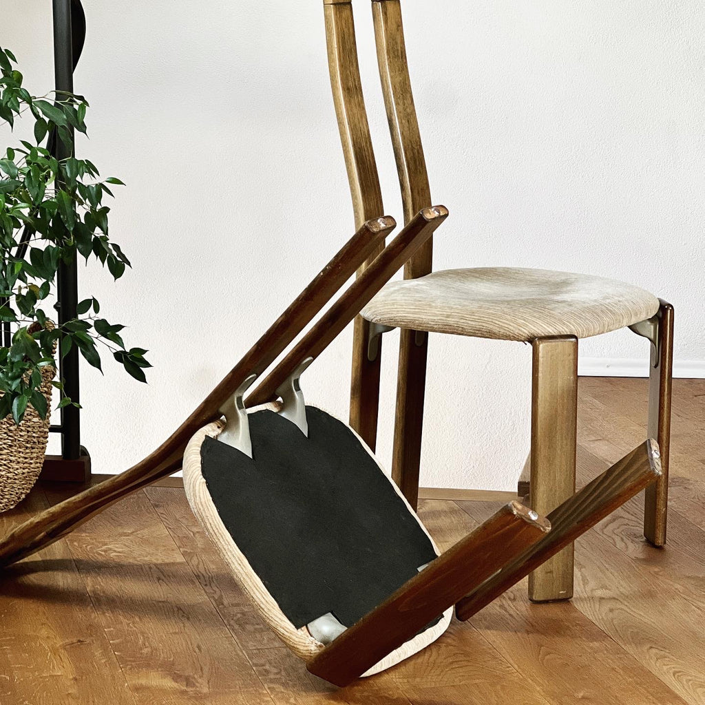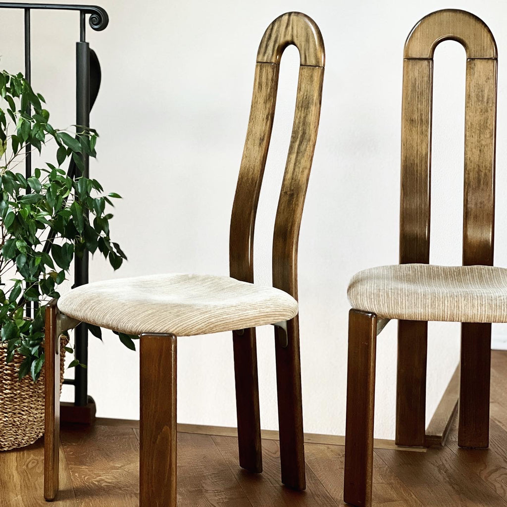 La chaises à haut dossier sont en chêne massif, l’assise et les pieds sont liés par les éléments en métal typiques de Bruno Rey. L'assise est en tissu beige, très bel état.
