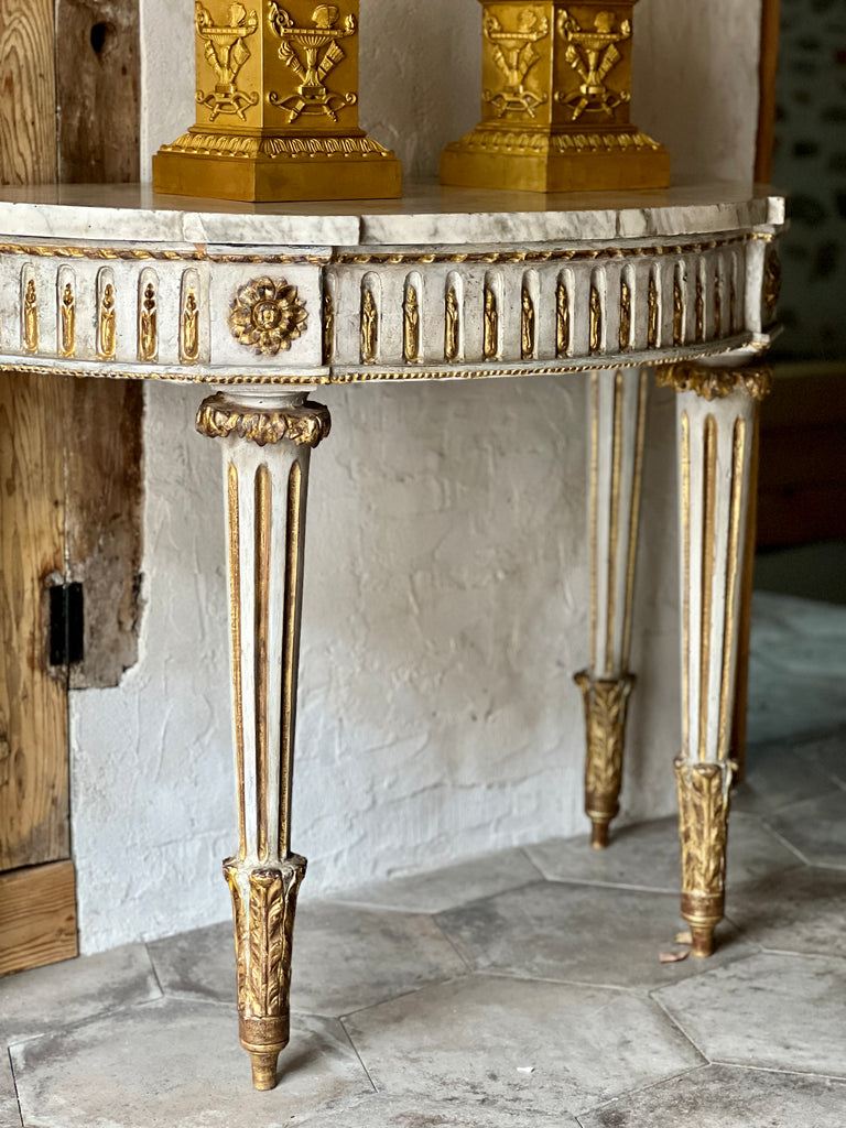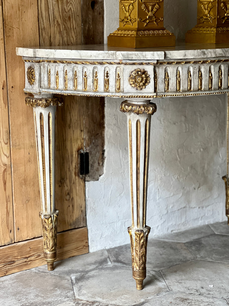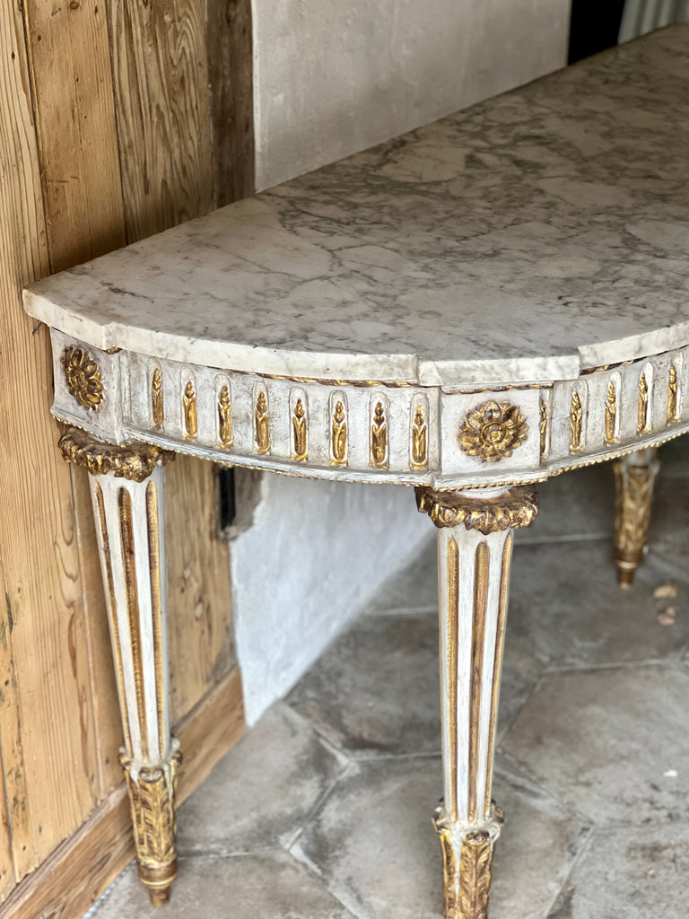 Magnifique console Louis XVI de forme demi-lune en bois blanchi et doré, décor sculpté sur la ceinture et les pieds. 4 pieds fuselés à cannelures.