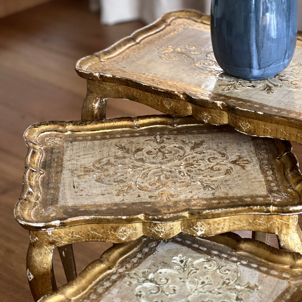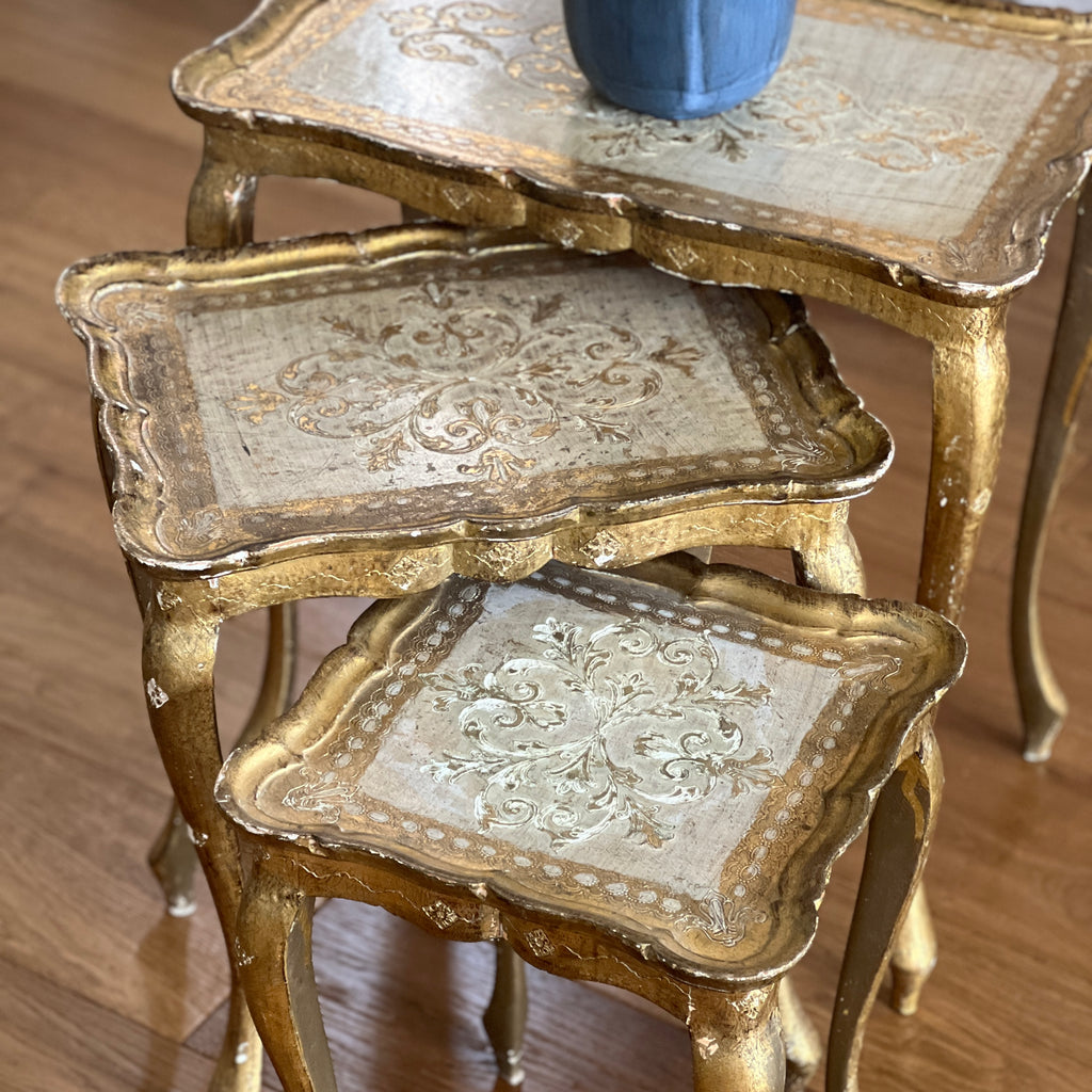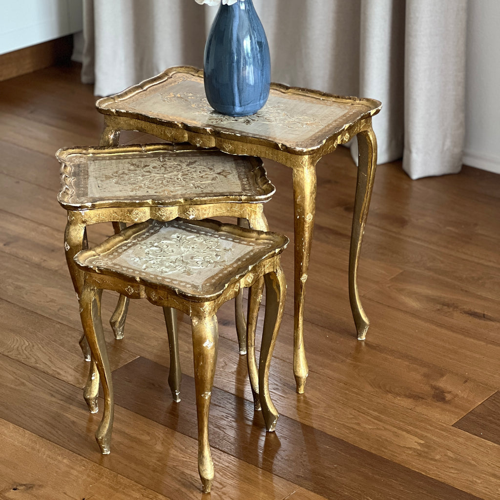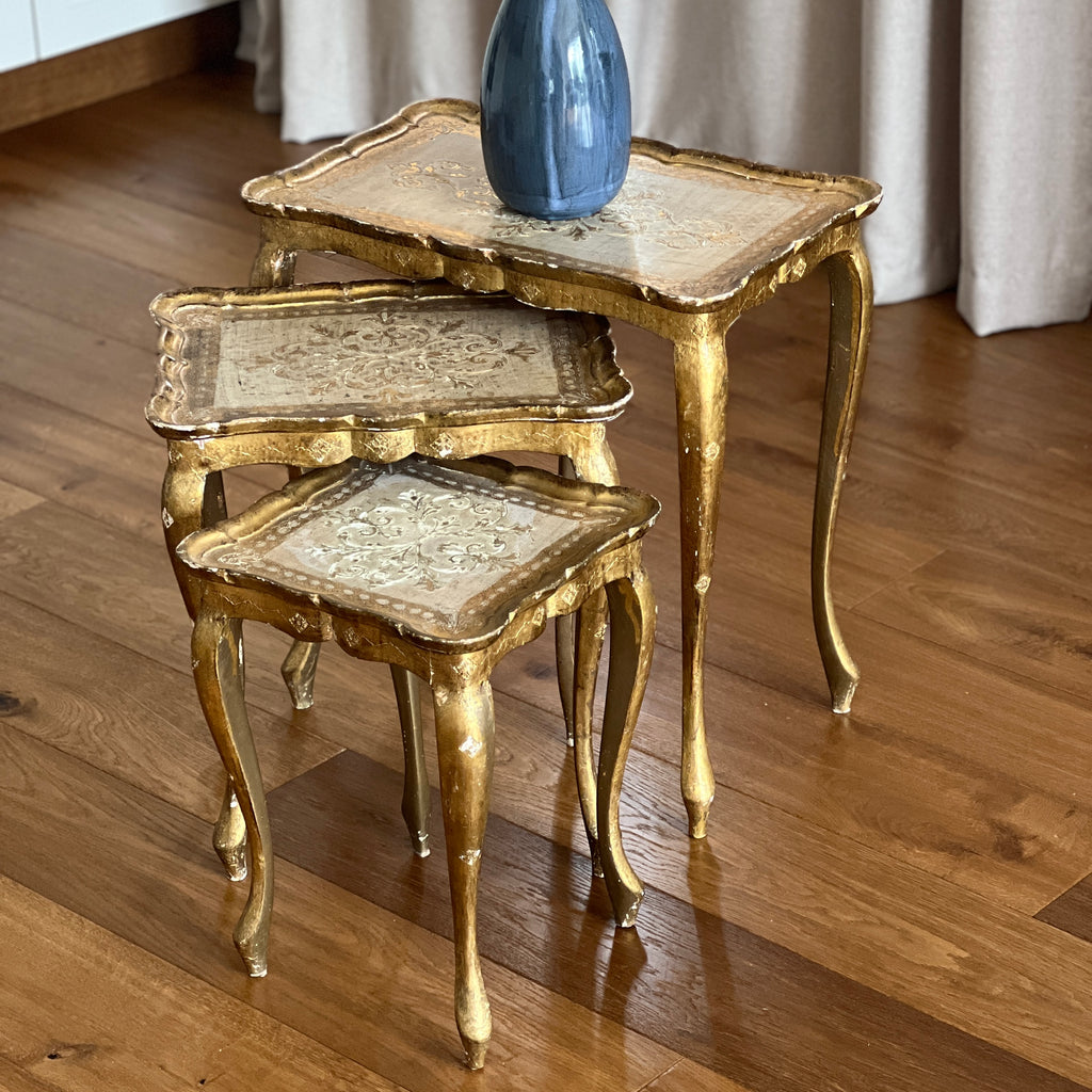 Belles tables gigognes florentines en bois doré, 1 tiroir, très belle patine !