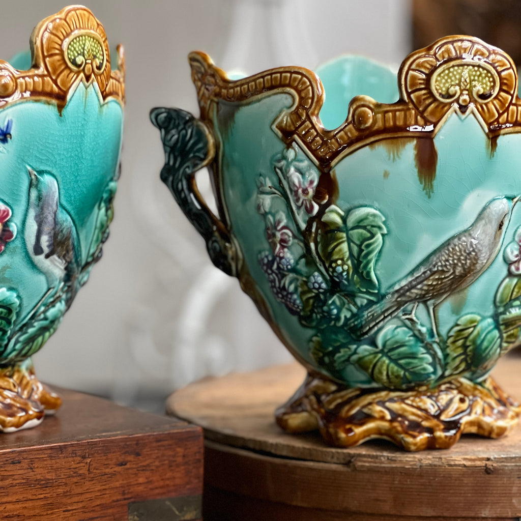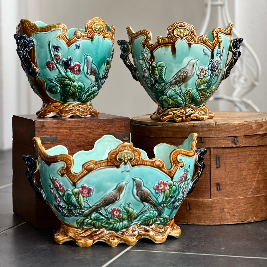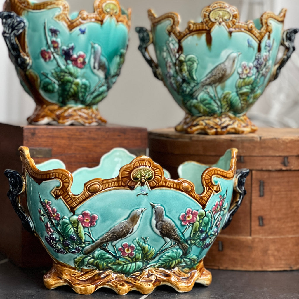Gros coup de coeur pour ces 3 barbotines aux oiseaux sur fond turquoise ! 🔥 Onnaing, très bel état, forme très original !