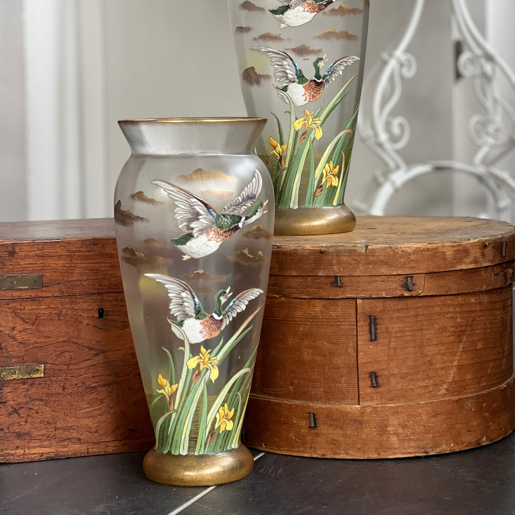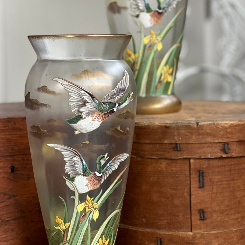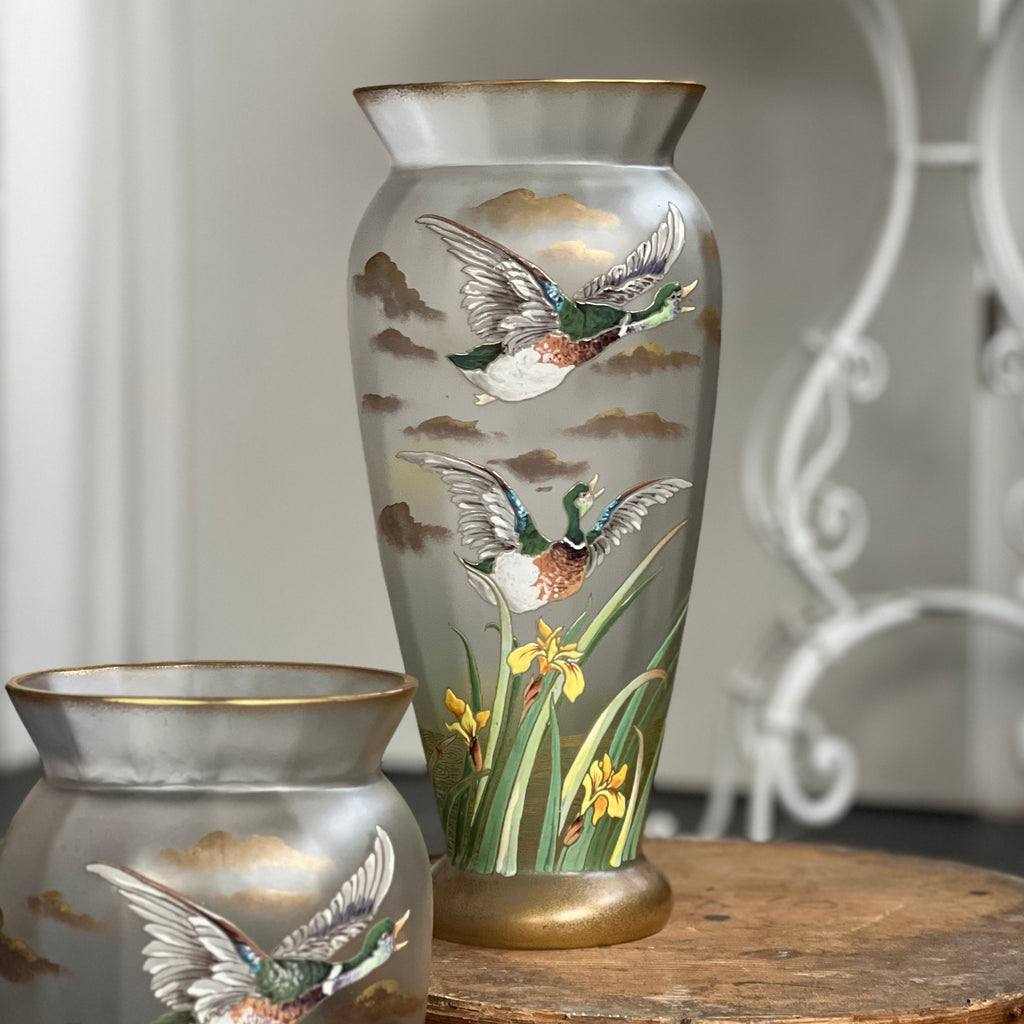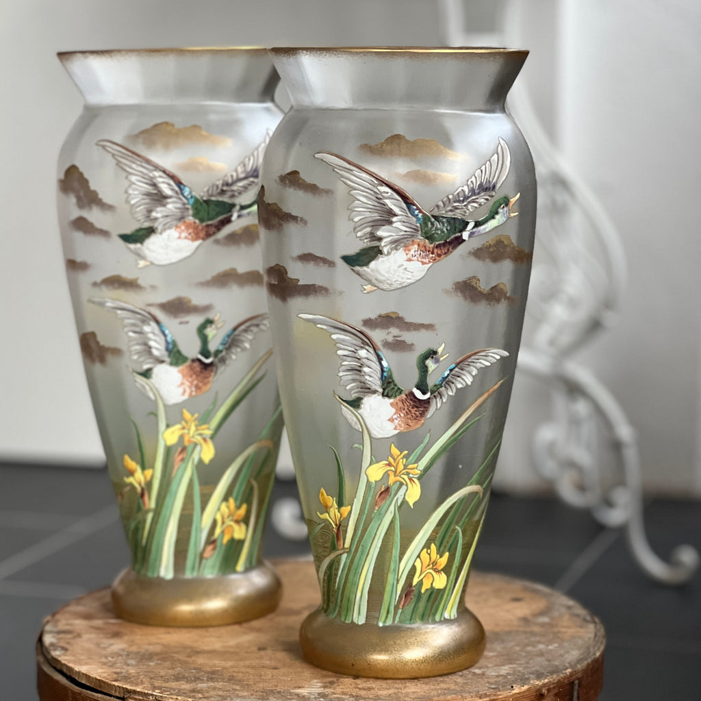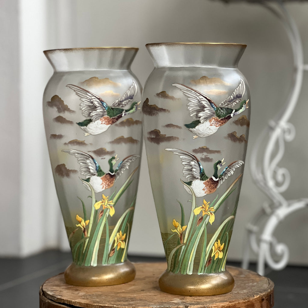 Splendide paire de vases art nouveau Legras Montjoye, décors de canard et d'iris émaillés. Parfait état !