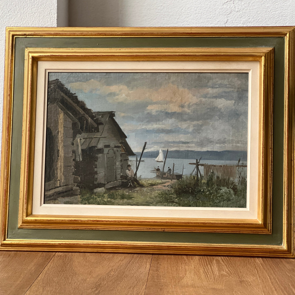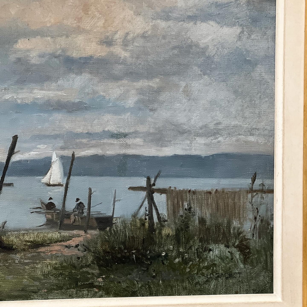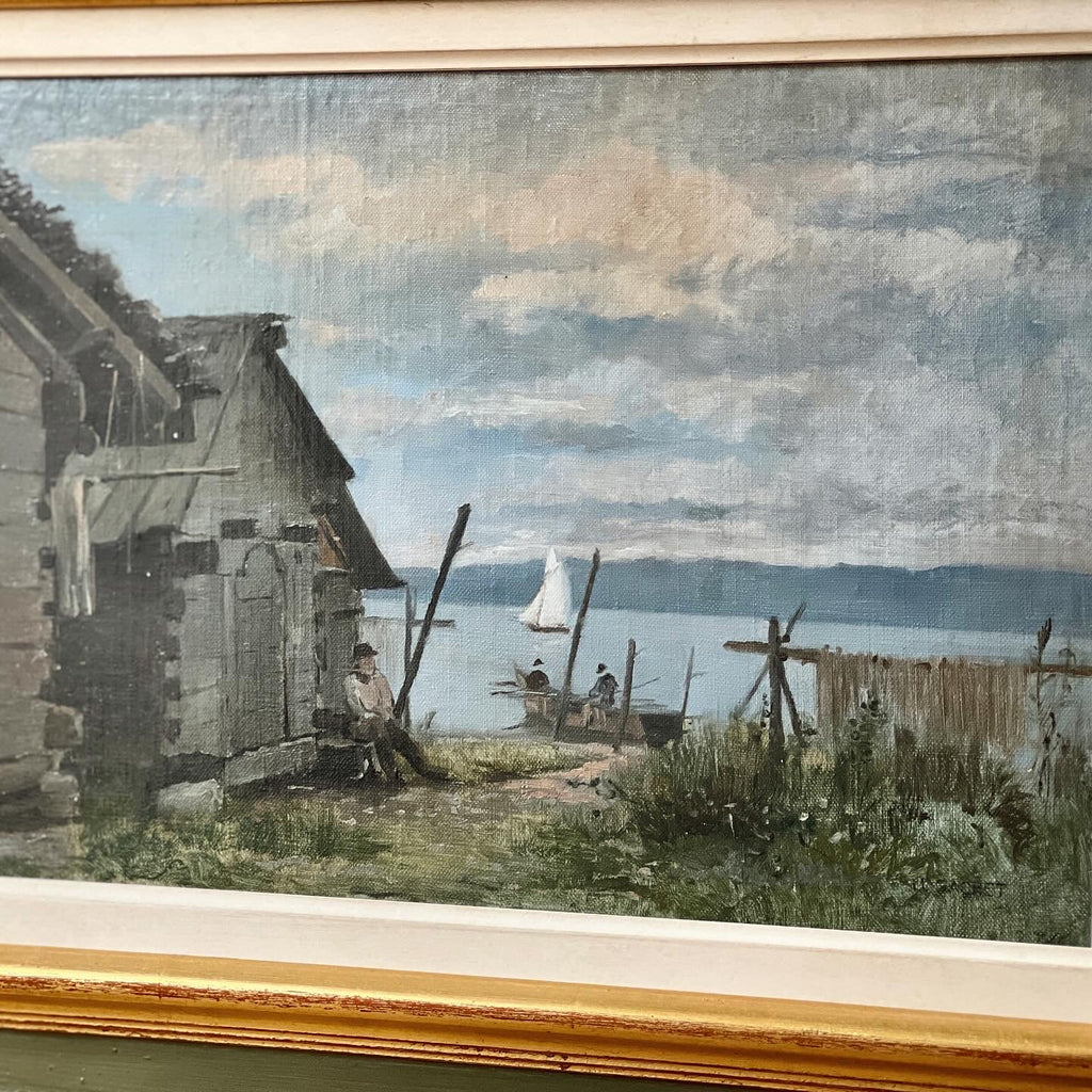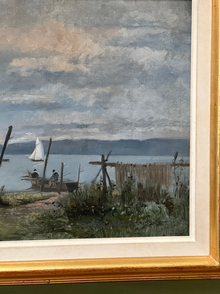 Magnifique tableau signé du réputé peintre suisse Jules Gachet (1859-1914). Une huile sur panneau dans un état impeccable représentant un ancien village de pêcheurs au bord du lac Léman.